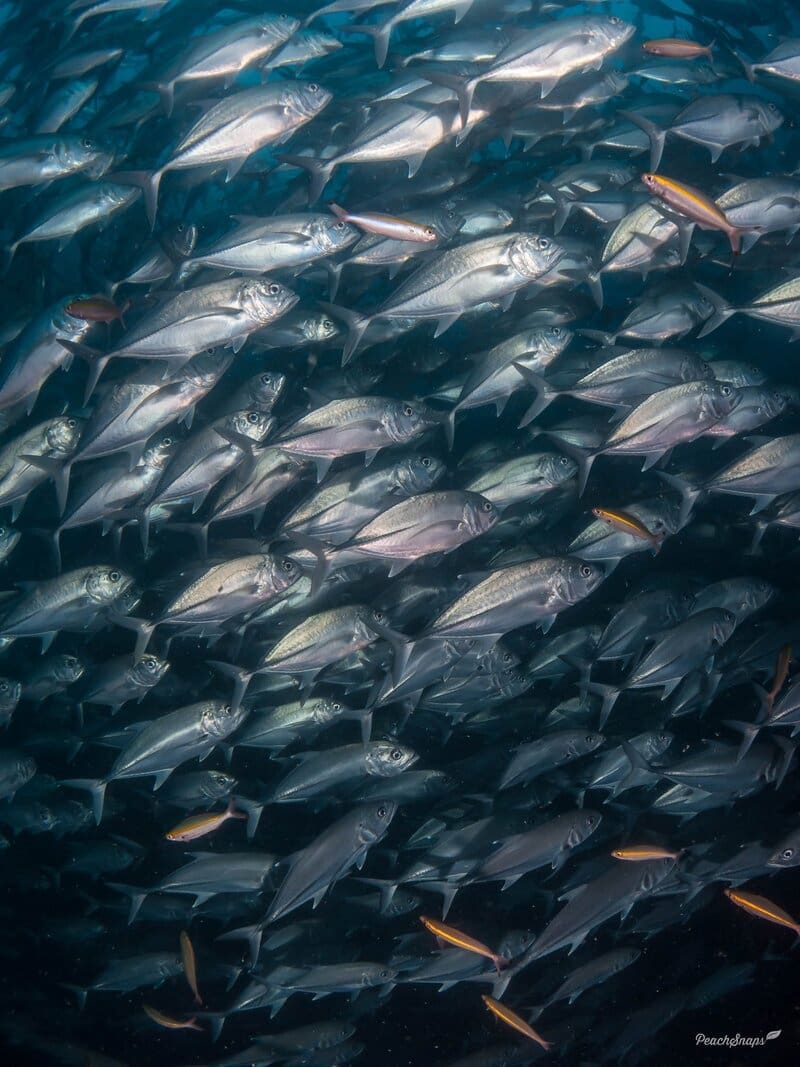 One amusing story often shared by divers involves the experience of swimming into a massive school of bigeye trevally. While the fish typically part to avoid contact, they sometimes circle divers out of curiosity, enveloping them in a shimmering vortex of fish. One diver described feeling like they were in a “fish tornado,” surrounded on all sides by hundreds of glistening trevallies, only to have the school suddenly disperse and reform as if nothing had happened. It’s a surreal and unforgettable experience that highlights the coordinated behavior of these fascinating creatures.